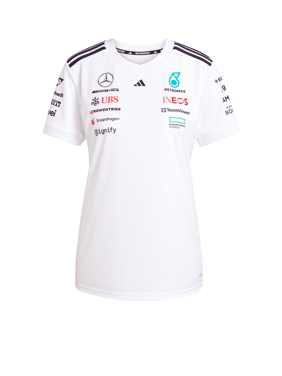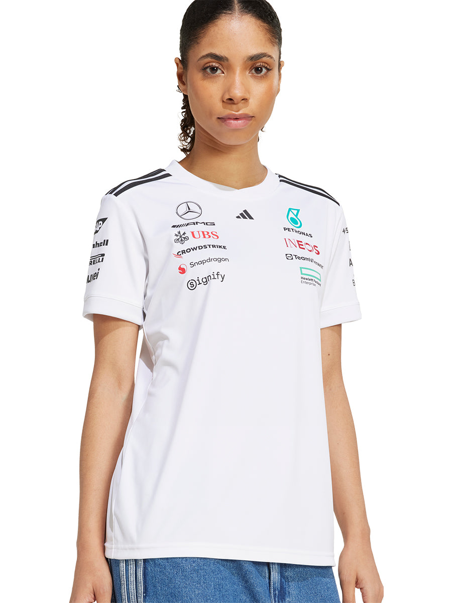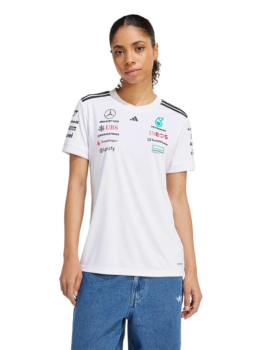 Look and feel like you're ready to take the wheel in this ADIDAS Women's Mercedes - AMG Petronas Formula One Team Driver Jersey. Built just like the ones worn on race day, this jersey features AEROREADY to manage moisture, providing both outstanding performance and elevated comfort. Mercedes - AMG Petronas Formula One Team logo branding and sponsor logos make the look authentic, while 3-Stripes on the shoulders and the 3 Bar Logo on the chest offer a signature adidas signoff.