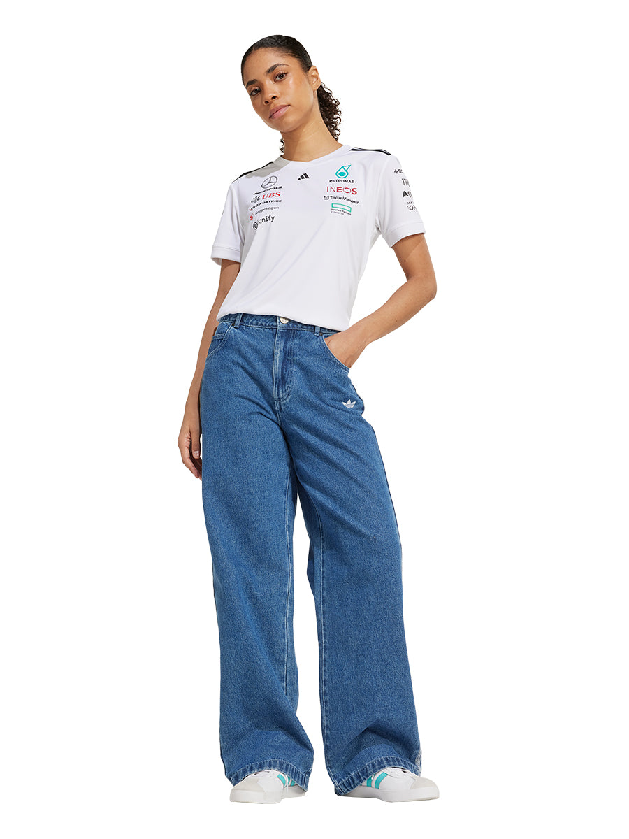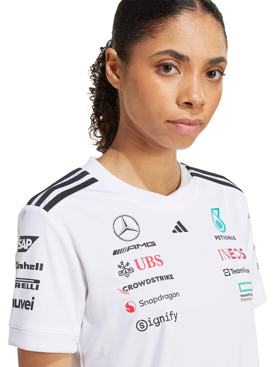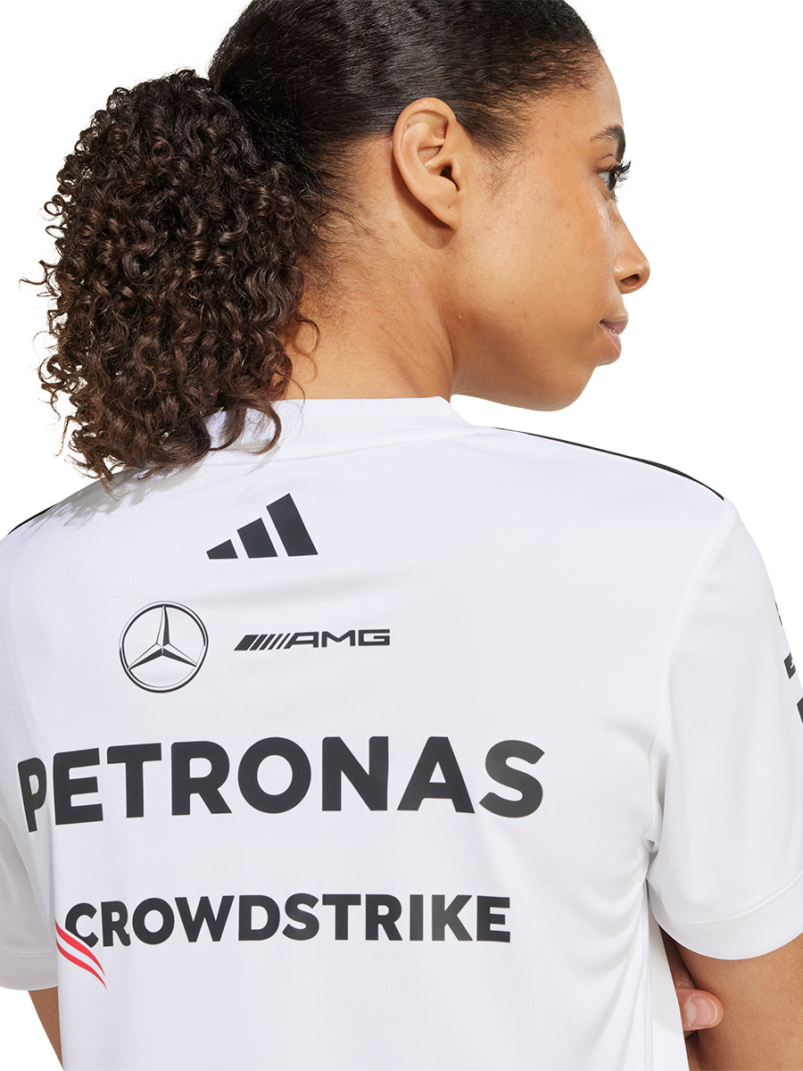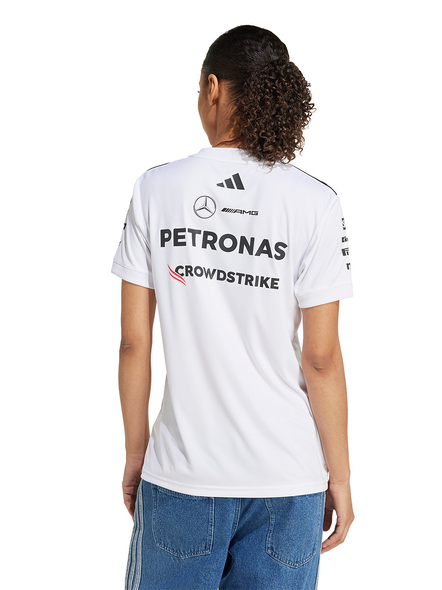 Look and feel like you're ready to take the wheel in this ADIDAS Women's Mercedes - AMG Petronas Formula One Team Driver Jersey. Built just like the ones worn on race day, this jersey features AEROREADY to manage moisture, providing both outstanding performance and elevated comfort. Mercedes - AMG Petronas Formula One Team logo branding and sponsor logos make the look authentic, while 3-Stripes on the shoulders and the 3 Bar Logo on the chest offer a signature adidas signoff.
