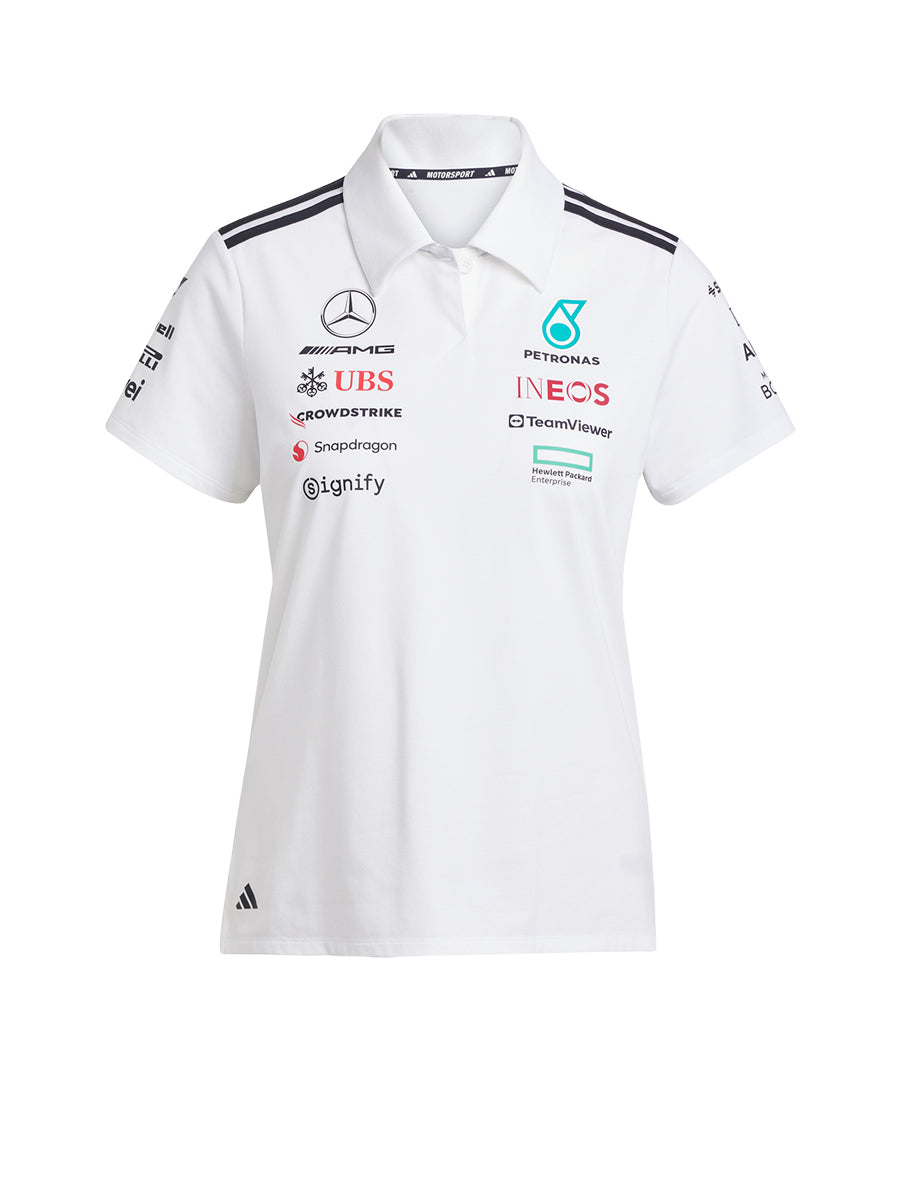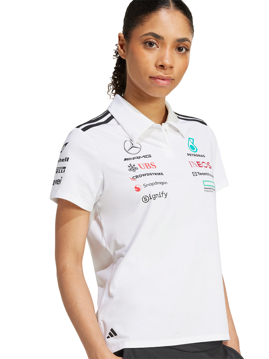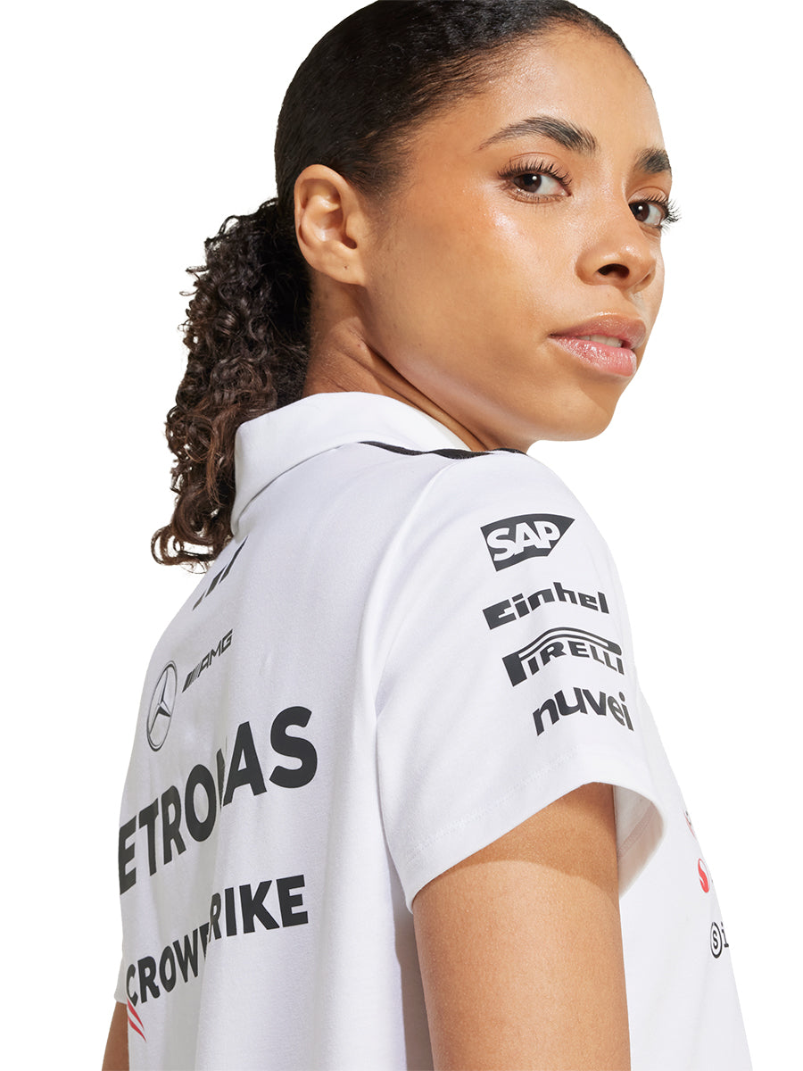 This ADIDAS Mercedes - AMG Petronas Formula One Team Women's Polo Shirt is just like the ones worn by the engineers for the Mercedes - AMG Petronas Formula One Team. The polyester and cotton build has some added stretch for comfortable movement, and slits on the side add a bit of extra coverage. Mercedes - AMG Petronas Formula One Team logo branding and sponsor logos on the chest keep the look totally authentic.
