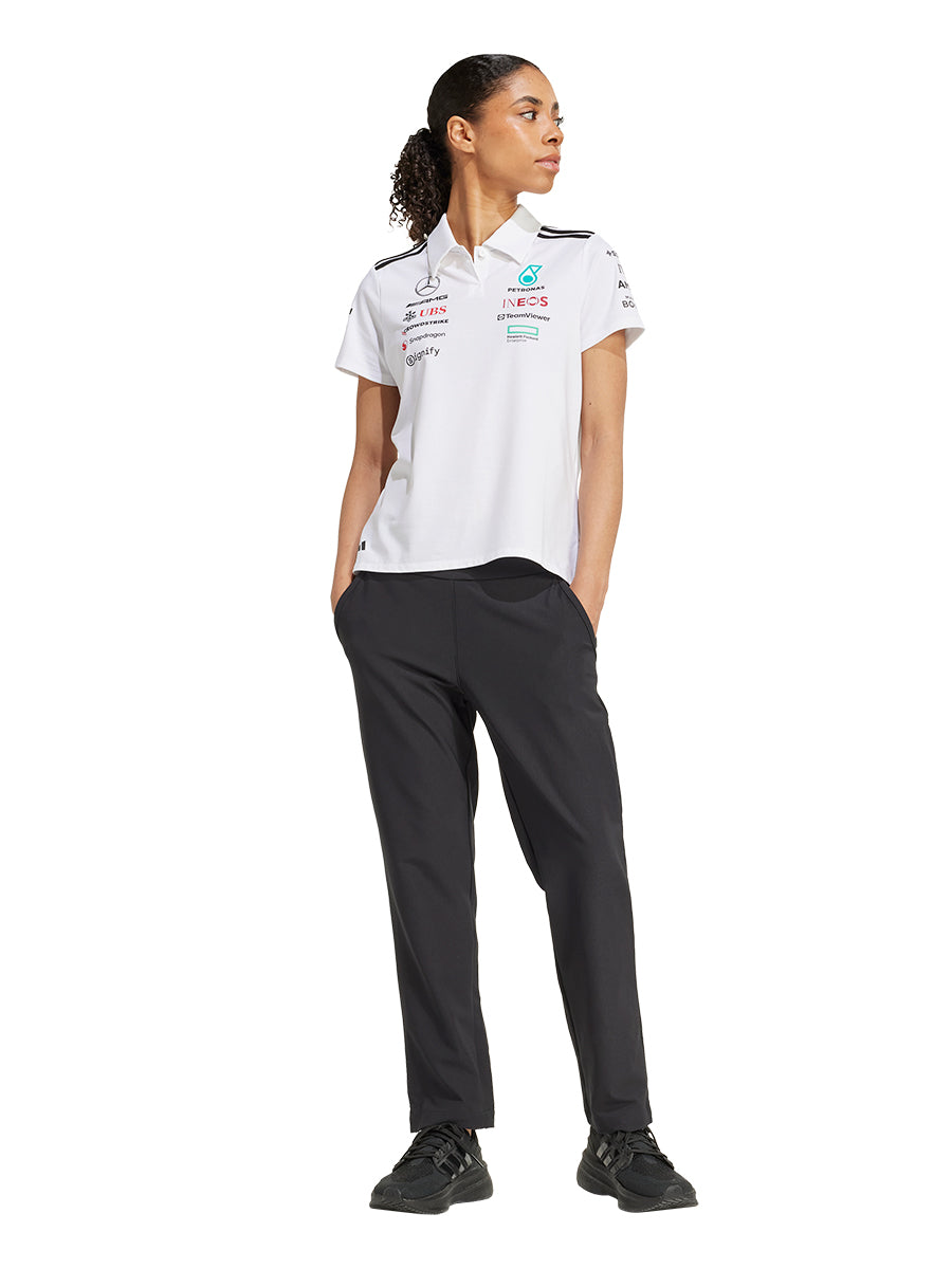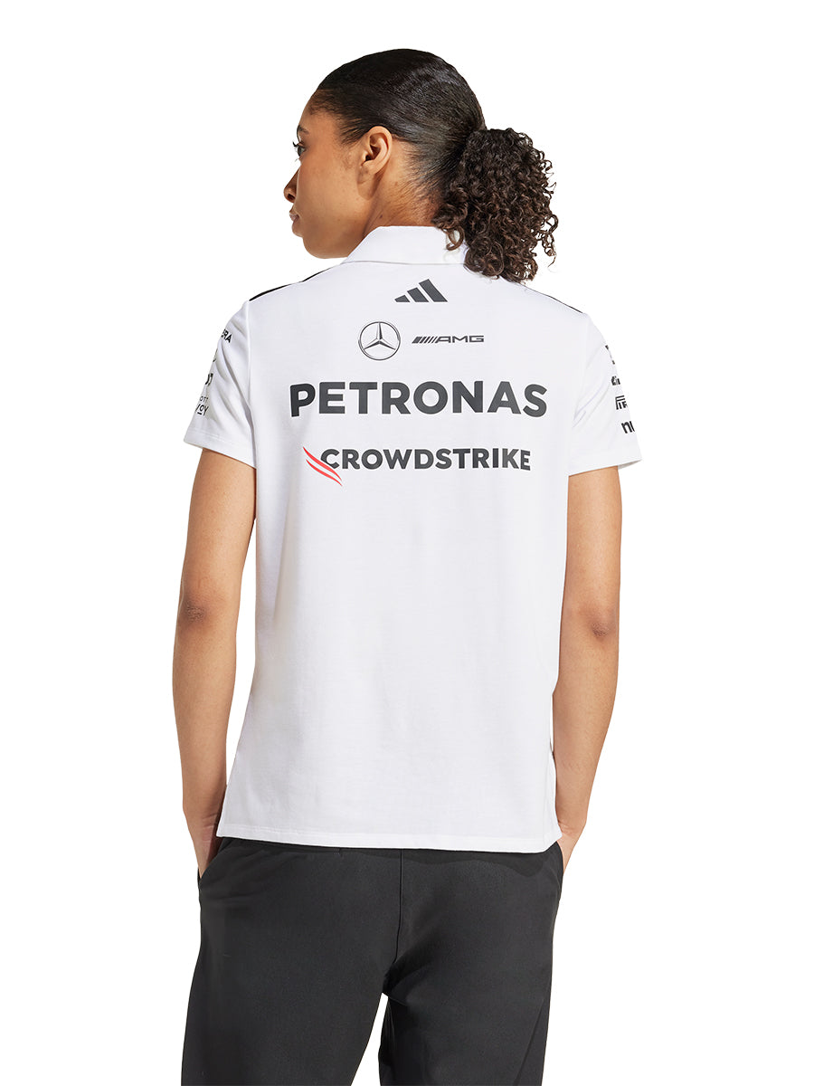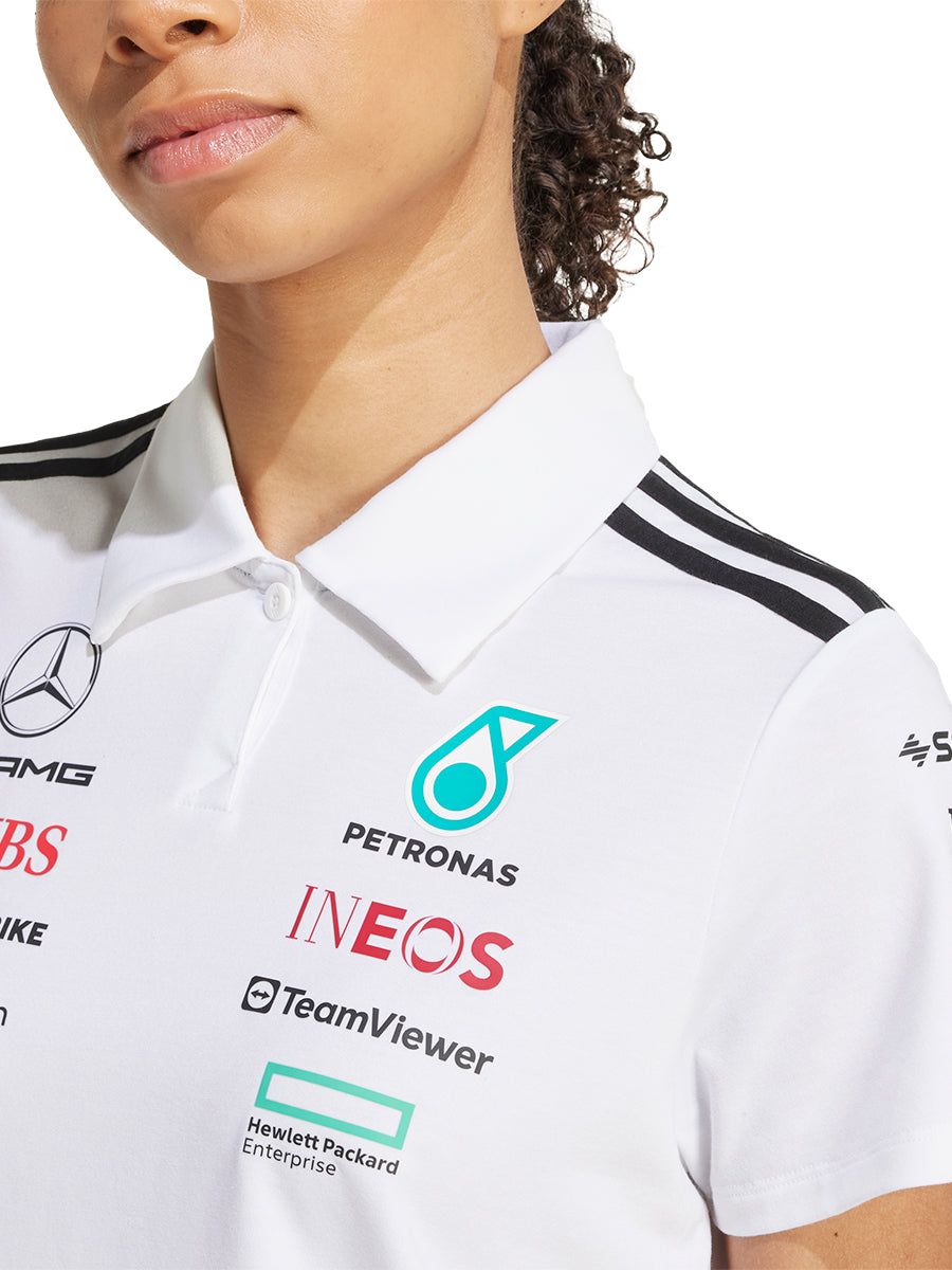 This ADIDAS Mercedes - AMG Petronas Formula One Team Women's Polo Shirt is just like the ones worn by the engineers for the Mercedes - AMG Petronas Formula One Team. The polyester and cotton build has some added stretch for comfortable movement, and slits on the side add a bit of extra coverage. Mercedes - AMG Petronas Formula One Team logo branding and sponsor logos on the chest keep the look totally authentic.