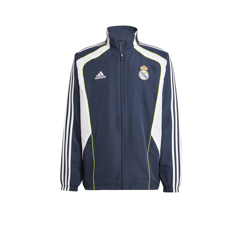 Borrowing from football fashions of the 2010s, this ADIDAS Real Madrid UBP Track Men's Football Jacket is a blast from the beautiful game's recent past. Bold blocks of white inspired by the club's famous home jerseys join intricate piping details for a stylish look. A subtle club badge joins an adidas Badge of Sport on the chest to show who you shout for.