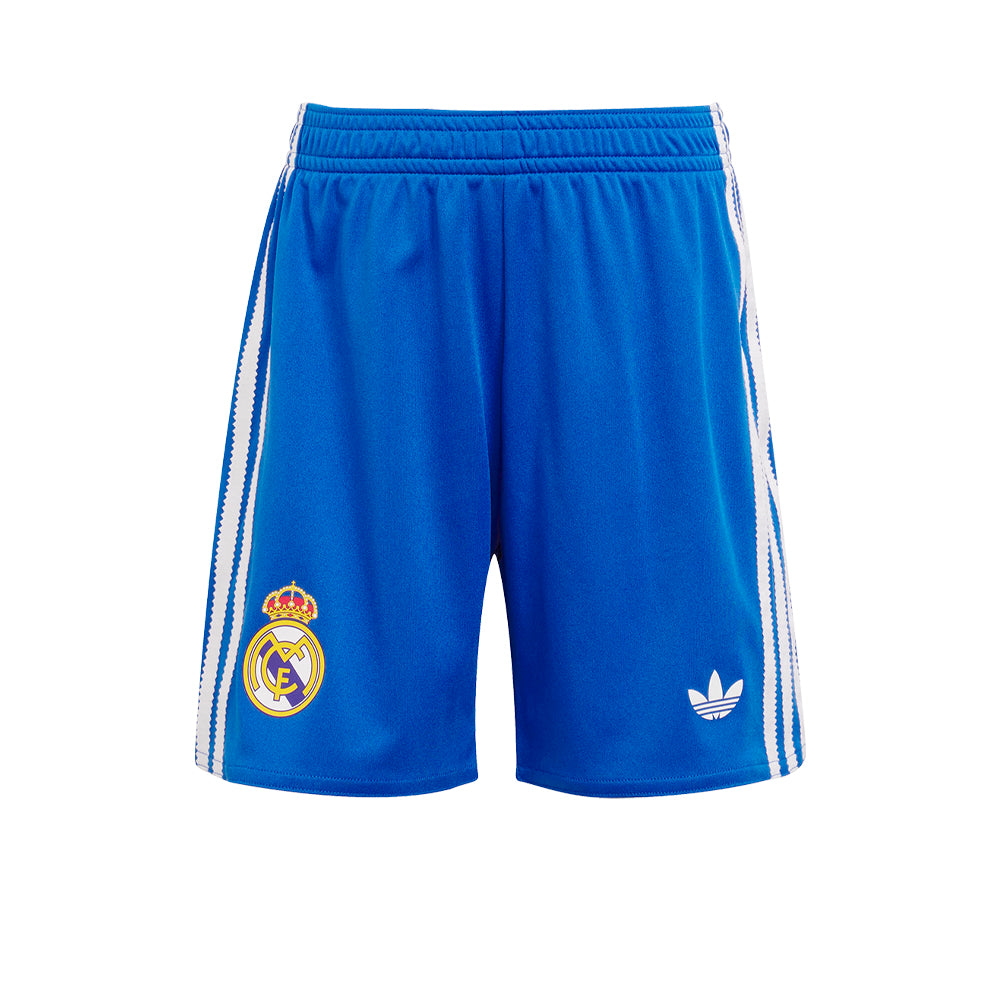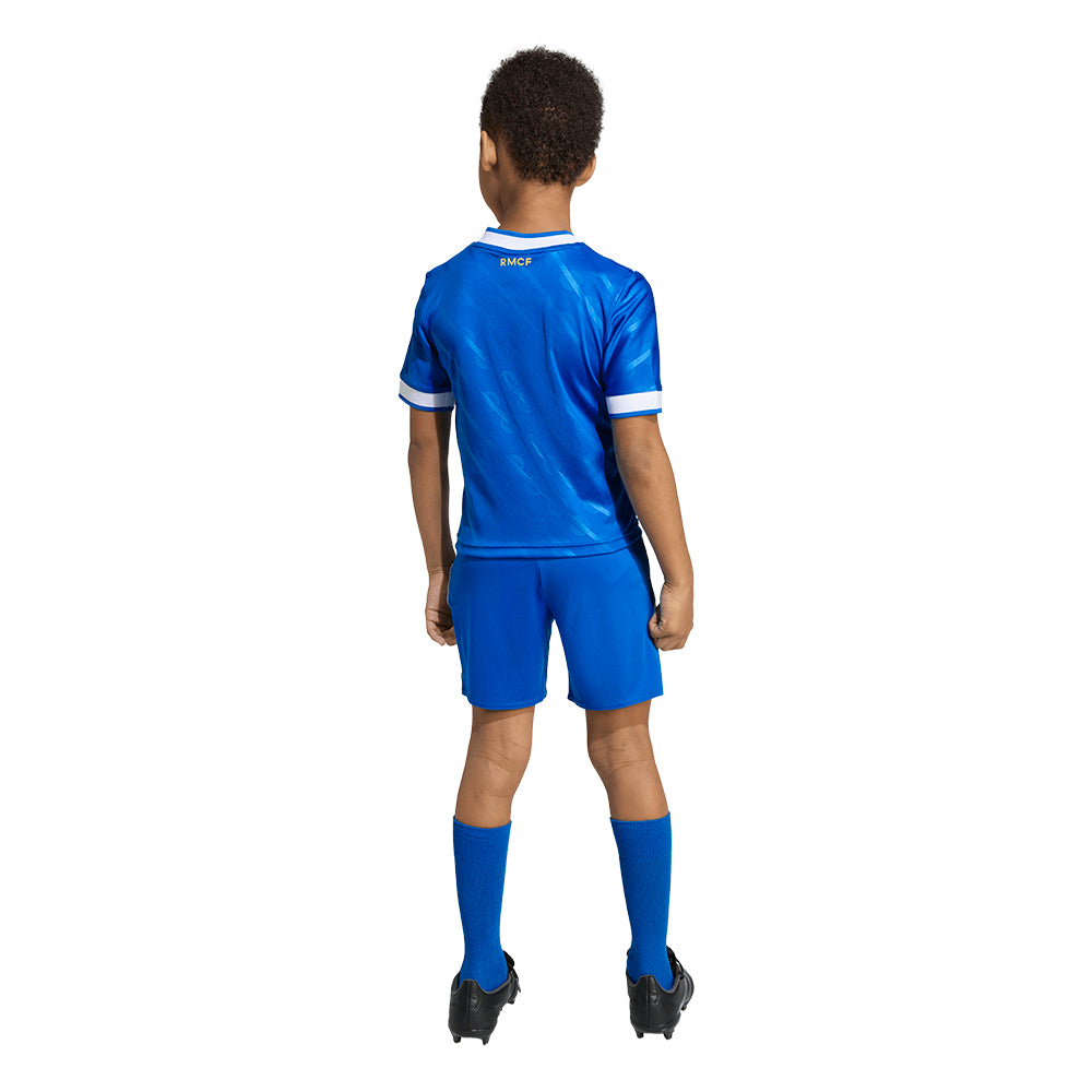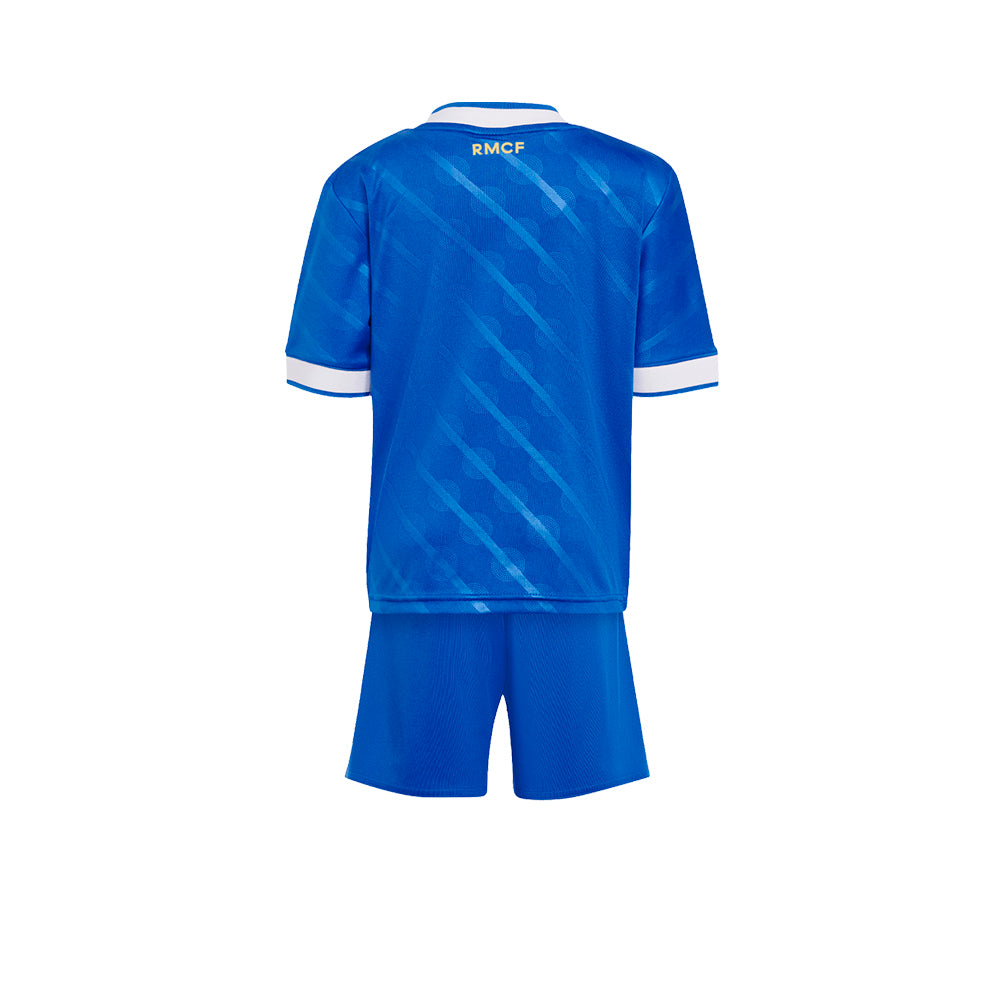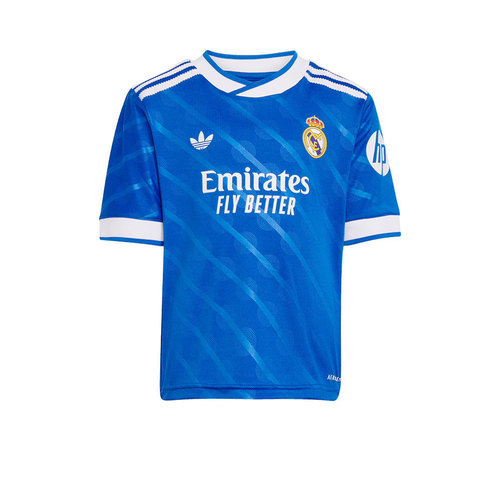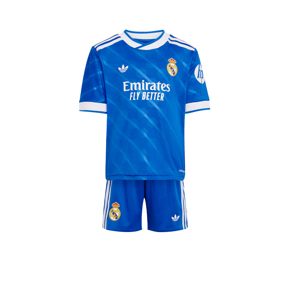 At home in blue. This ADIDAS Kids Real Madrid Third 2025/26 Mini Kit comes in a hue that's close to the hearts of Madridistas and 3-Stripes fans. A classic ADIDAS ORIGINALS colourway and a subtle nod to the Bernabéu's identity, it's the perfect shade to celebrate the ultimate football partnership. Including a jersey, shorts and socks, this sized-down set ensures young fans stay dry, comfy and focused on their fandom.