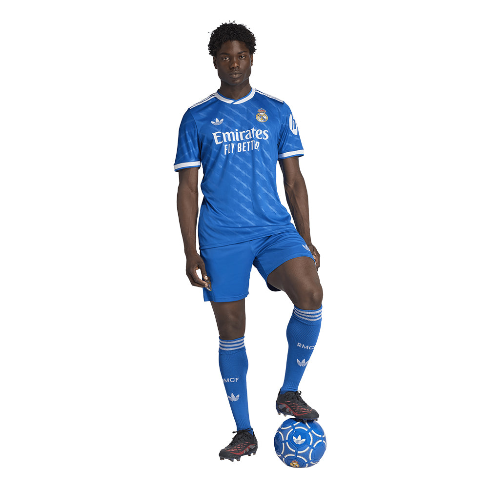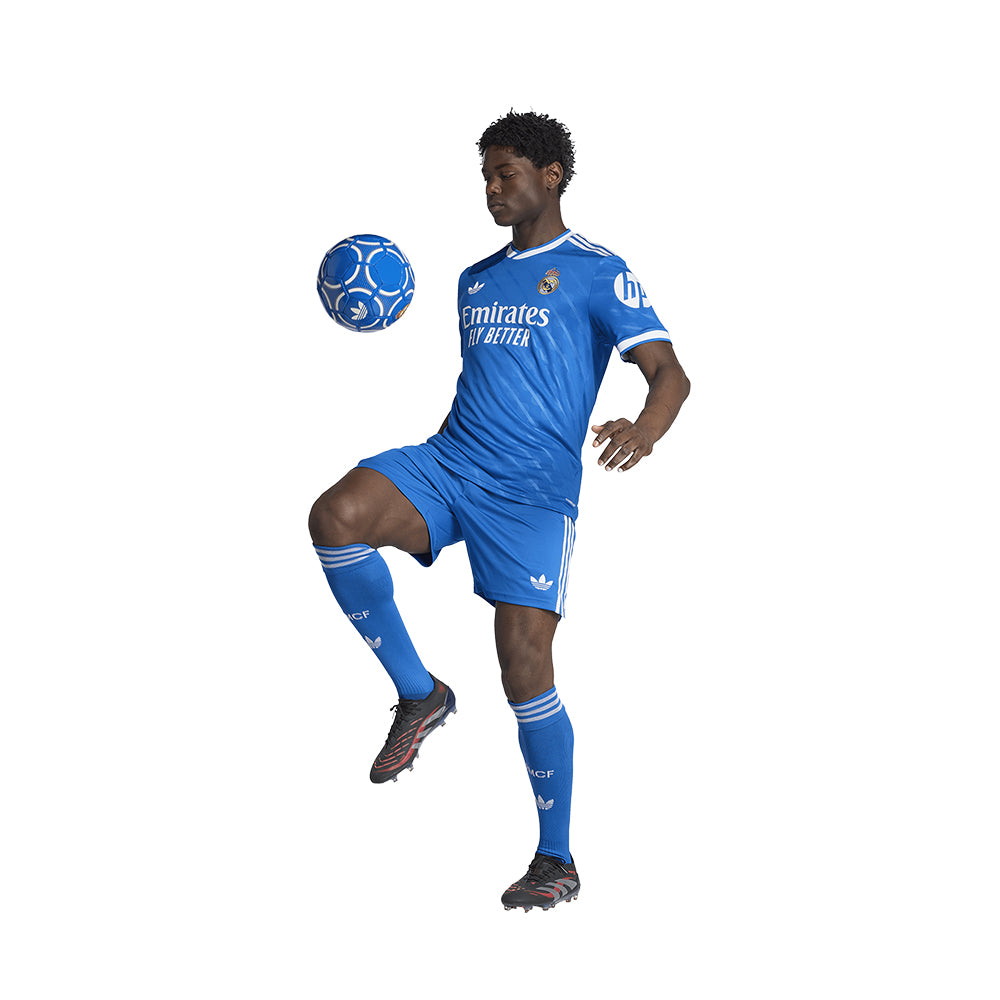 Show your devotion to Real Madrid wherever the day takes you in these ADIDAS Men's Real Madrid Third 2025/26 Football Shorts. Clad in blue colours that will strike a chord with the club's fans and adidas aficionados, they'll make a sporty statement whenever you pull them on. Moisture-controlling AEROREADY keeps you comfortable and an embroidered Trefoil adds the perfect retro finish.