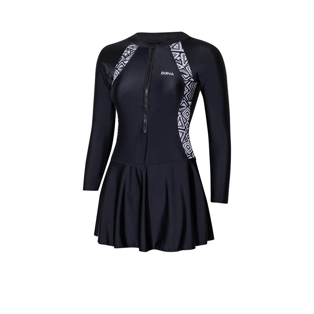 Dive into your next swim adventure with the BONA L-143 Women's Swimsuit. This stylish one-piece features long sleeves and a modest skirted design, offering both comfort and coverage.