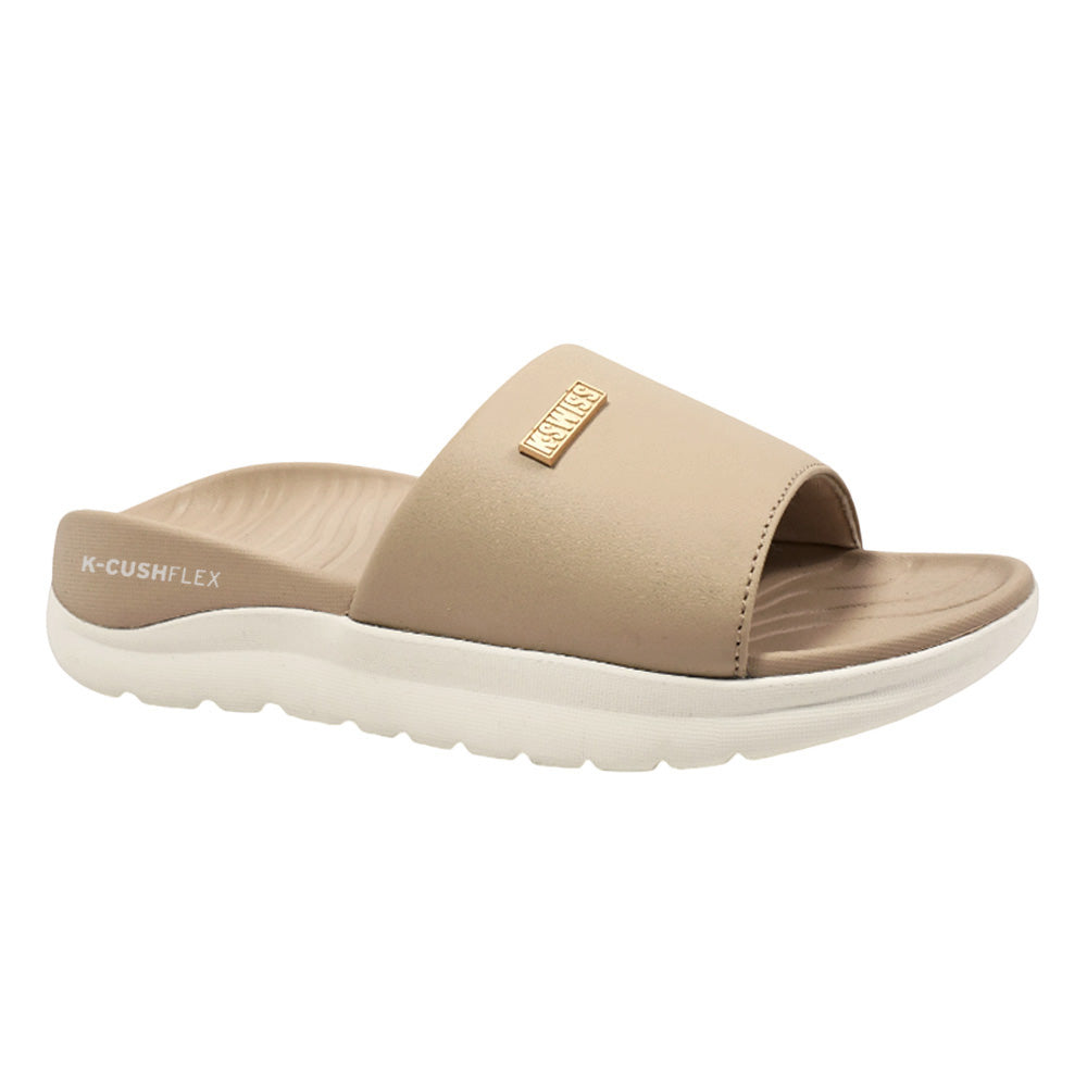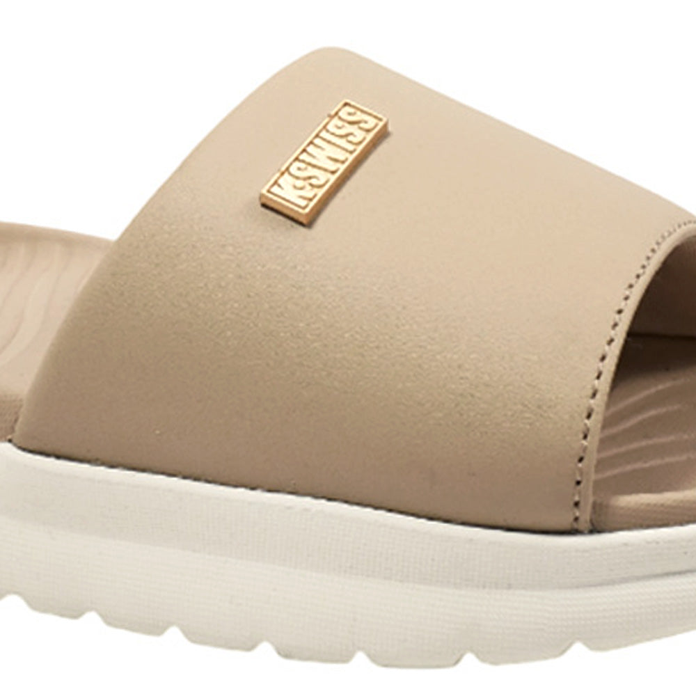 The K-SWISS Fuzzy Women's Sandals are engineered for long-lasting comfort, featuring an EVA outsole with friction lines for enhanced grip. The soft insole effectively absorbs pressure during extended wear, complemented by a sloped heel for proper walking mechanics. A durable PU upper, foam-padded for comfort, showcases a premium Kswiss metal plate.