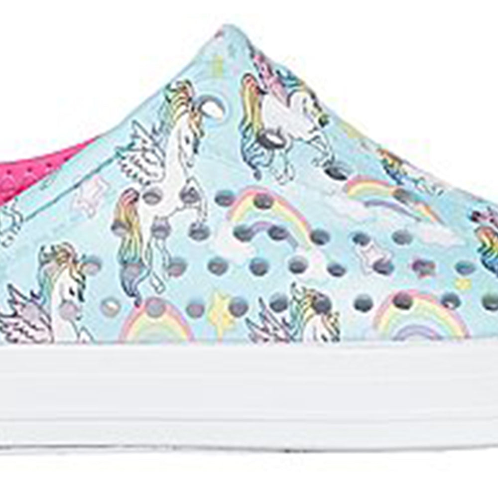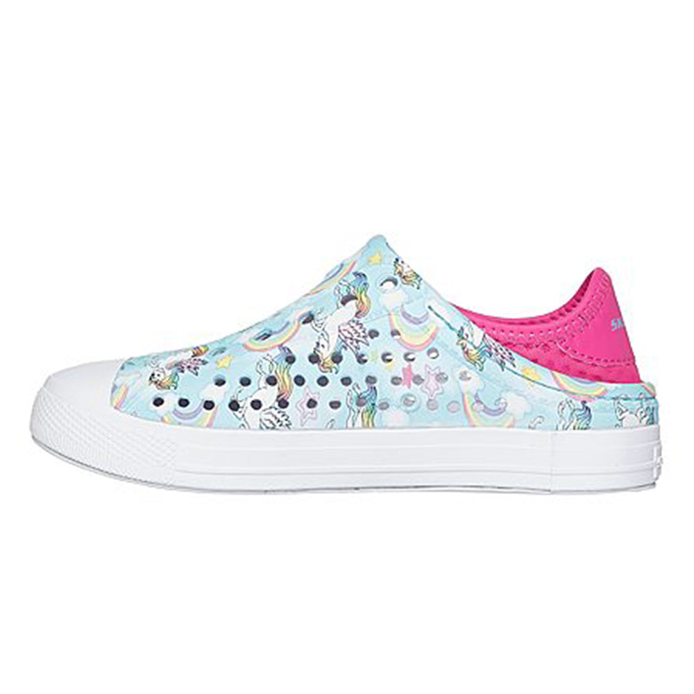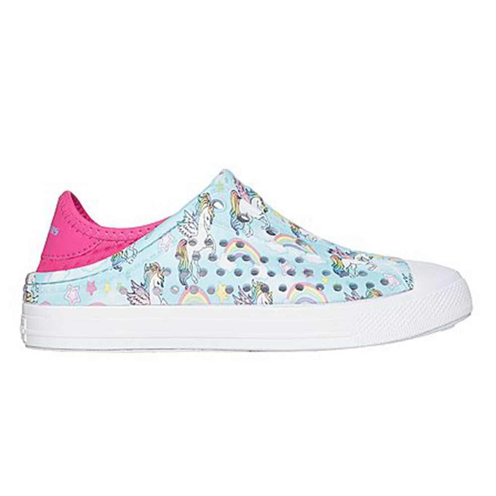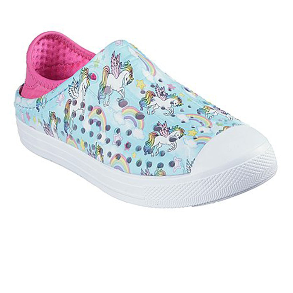 Soar into magical fun and comfort wearing SKECHERS Foamies®: Guzman Steps Girls Casual Shoes. This water-friendly design features a perforated Foamies® EVA upper with a collapsible neoprene heel and a cushioned comfort footbed.