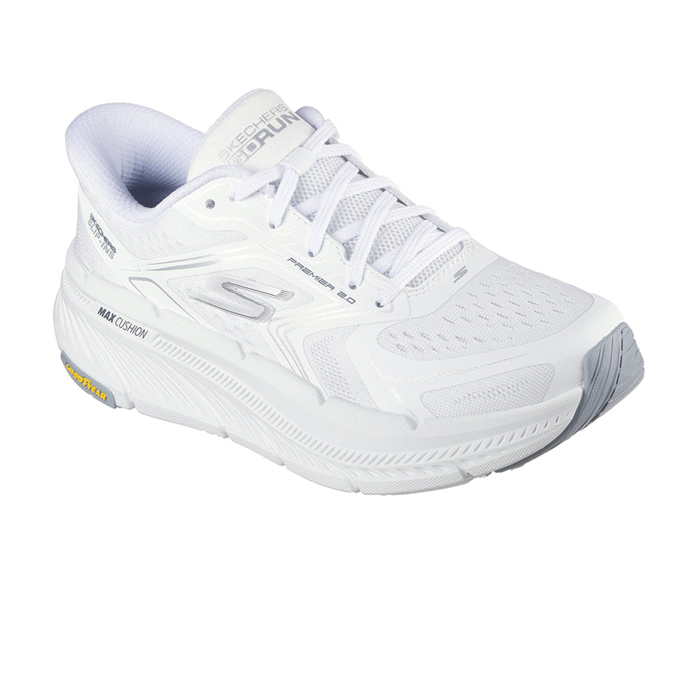 Elevate your performance with supreme comfort wearing SKECHERS Hands Free Slip-ins®: Max Cushioning Premier 2.0™ - Overland Women's Running Shoes. Designed with our Exclusive Heel Pillow™, this vegan running style features an engineered mesh upper with adjustable laces, Skechers Air-Cooled Memory Foam® insole with copper infused footbed lining, plus a Max Cushioning® midsole - all on an anti-slip Goodyear® Rubber Outsole.