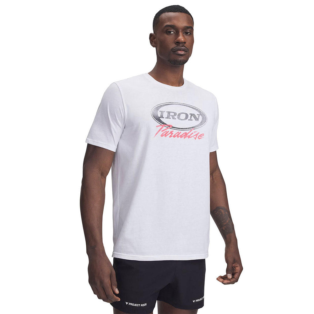 The UNDER ARMOUR Project Rock Iron Men's Training T-Shirt was built for the hardest workers in the room. This graphic tee is comfortable, dries quick, and pays homage to Dwayne Johnson's gym, the Iron Paradise.