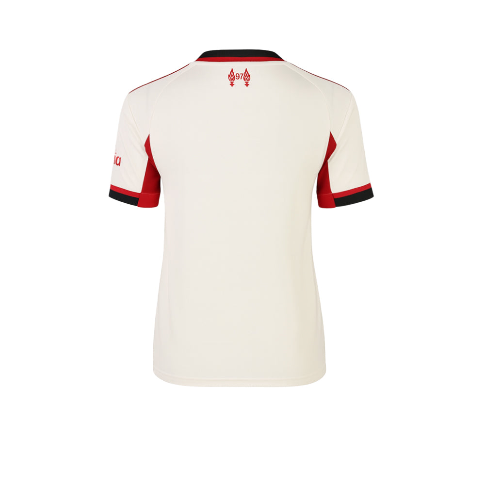 ในฤดูกาล 2025/26 ไม่ว่าที่ไหนก็คือ Anfield เสื้อแข่งผู้หญิงทีมลิเวอร์พูล ชุดเยือน ฤดูกาล 2025/26 จาก ADIDAS รุ่นนี้ ออกแบบมาเพื่อช่วยให้ทีมคว้าชัยชนะในเกมเยือน โดดเด่นด้วยตราสโมสรดีไซน์พิเศษ ที่ได้แรงบันดาลใจจากจั่วโค้งด้านบนของอัฒจันทร์ Main Stand เก่าใน Anfield มาพร้อมเทคโนโลยี AEROREADY ที่ควบคุมความชื้นและเนื้อผ้าที่นุ่มสบายช่วยให้แฟนบอลที่เดินทางมาได้รู้สึกสบายตัว เฉดสีขาวขุ่นจะเป็นสีที่คุ้นเคย เหมาะสำหรับสำหรับแฟนบอล The Reds ผู้ที่รู้ประวัติศาสตร์ความเป็นมาของทีมเป็นอย่างดี