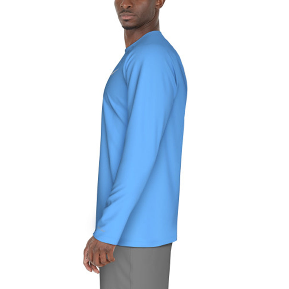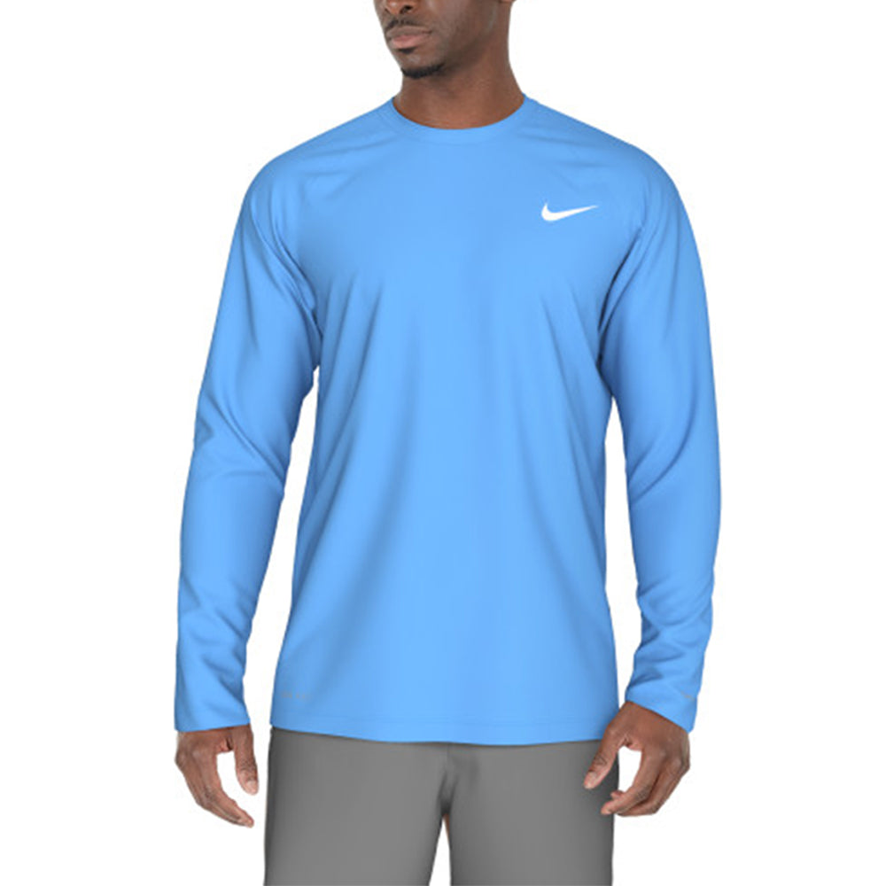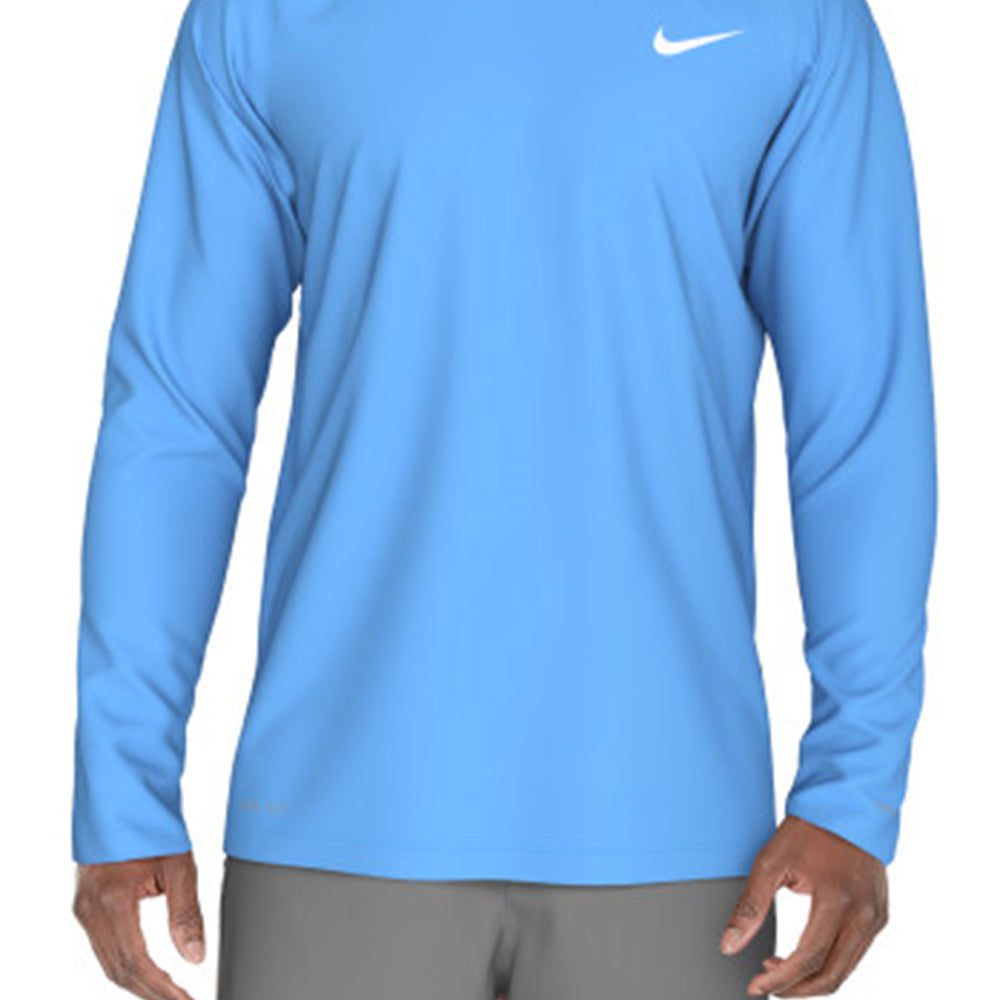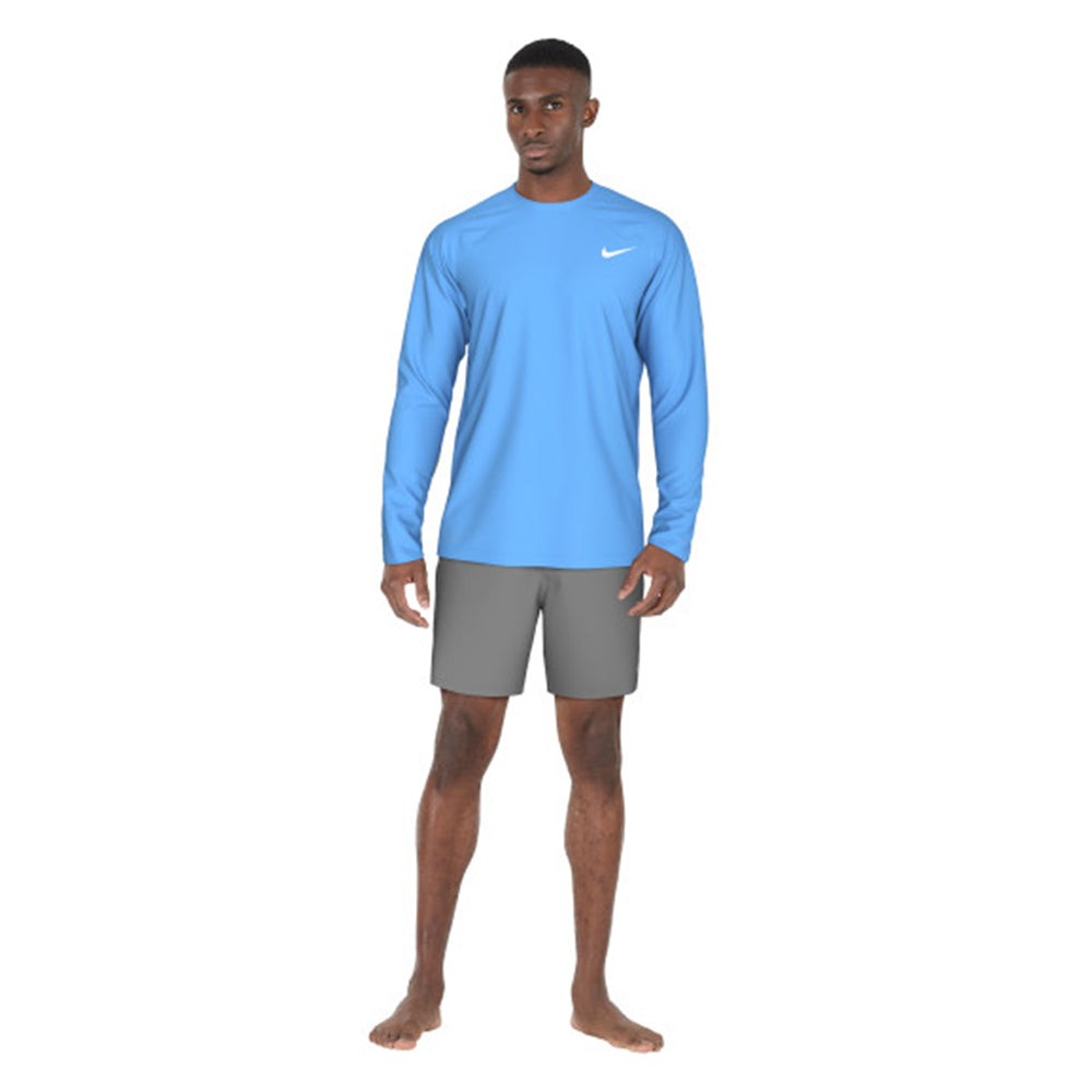 เสื้อว่ายน้ำผู้ชาย NIKE Essential Long Sleeve Hydroguard ช่วยปกป้องแสงแดดจากรังสี UV ขณะออกกำลังกายกลางแจ้ง เนื้อผ้าถักช่วยให้เสื้อตัวนี้ยืดหยุ่นตามธรรมชาติเพื่อความสบายพอดีตัว ขณะที่เทคโนโลยีระบายเหงื่อช่วยจัดการความชื้น