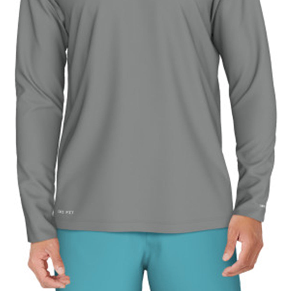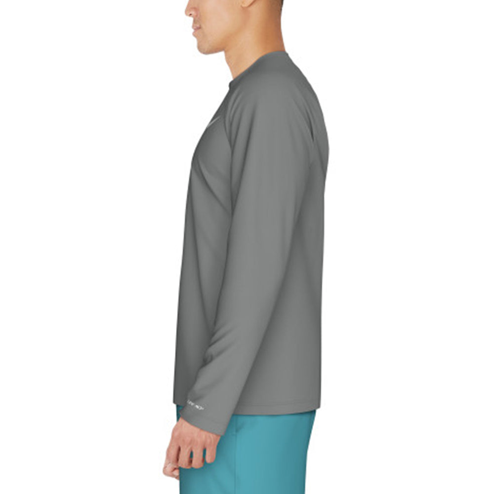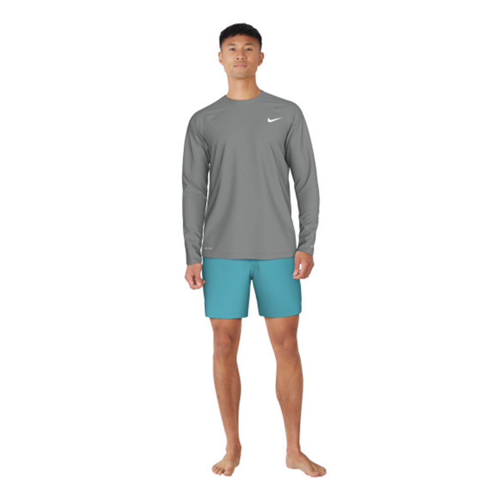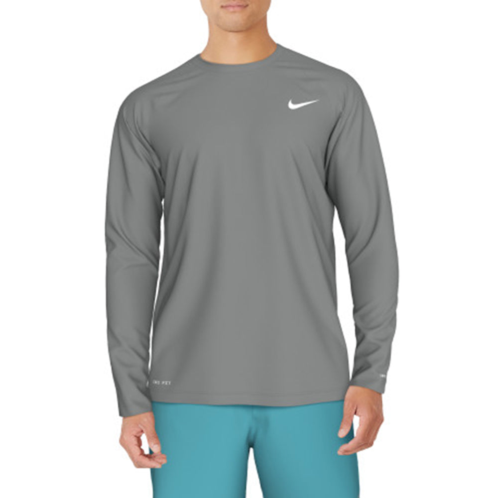 เสื้อว่ายน้ำผู้ชาย NIKE Essential Long Sleeve Hydroguard ช่วยปกป้องแสงแดดจากรังสี UV ขณะออกกำลังกายกลางแจ้ง เนื้อผ้าถักช่วยให้เสื้อตัวนี้ยืดหยุ่นตามธรรมชาติเพื่อความสบายพอดีตัว ขณะที่เทคโนโลยีระบายเหงื่อช่วยจัดการความชื้น