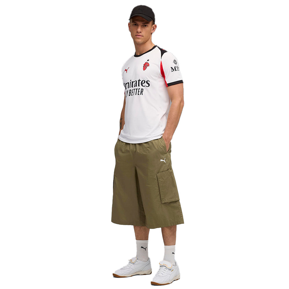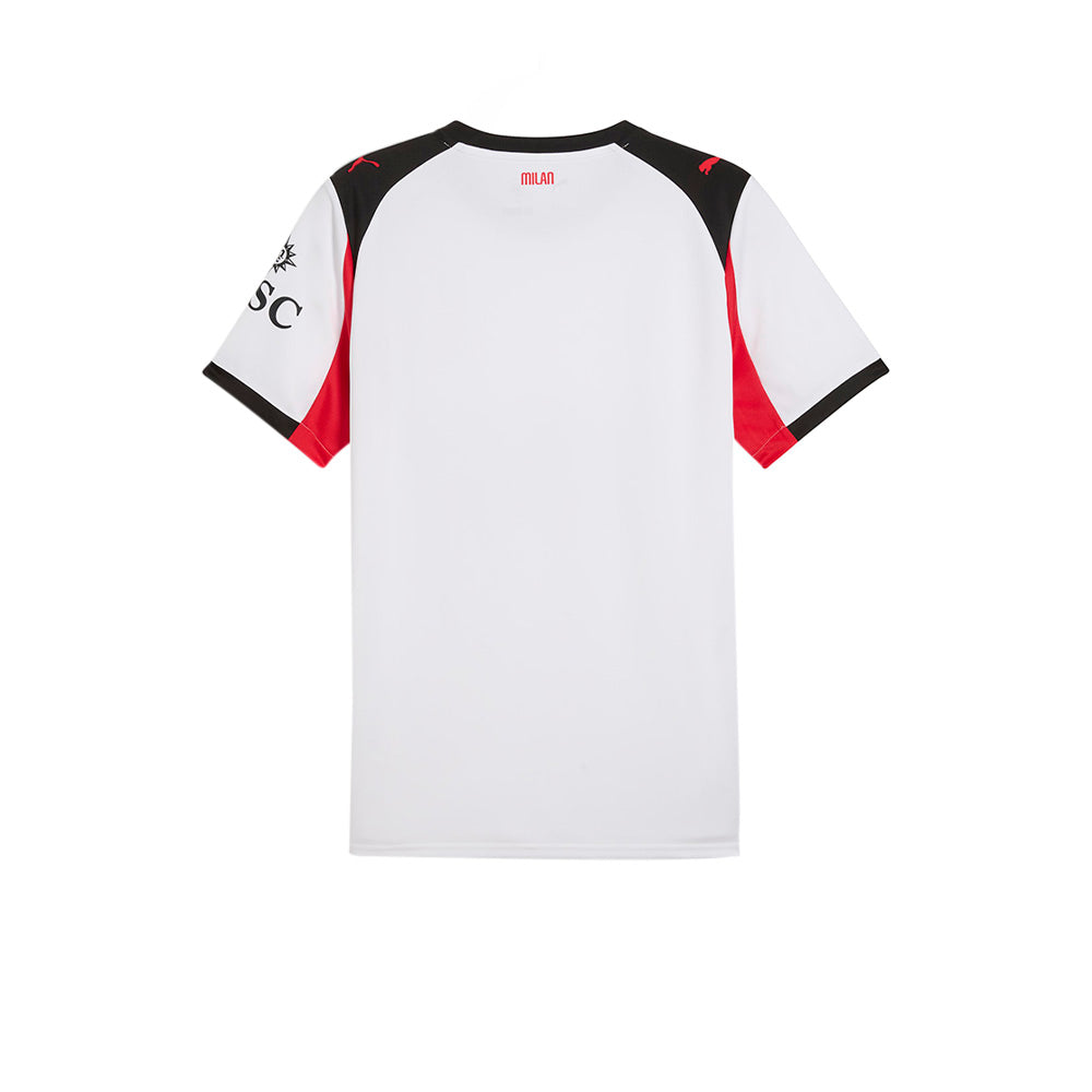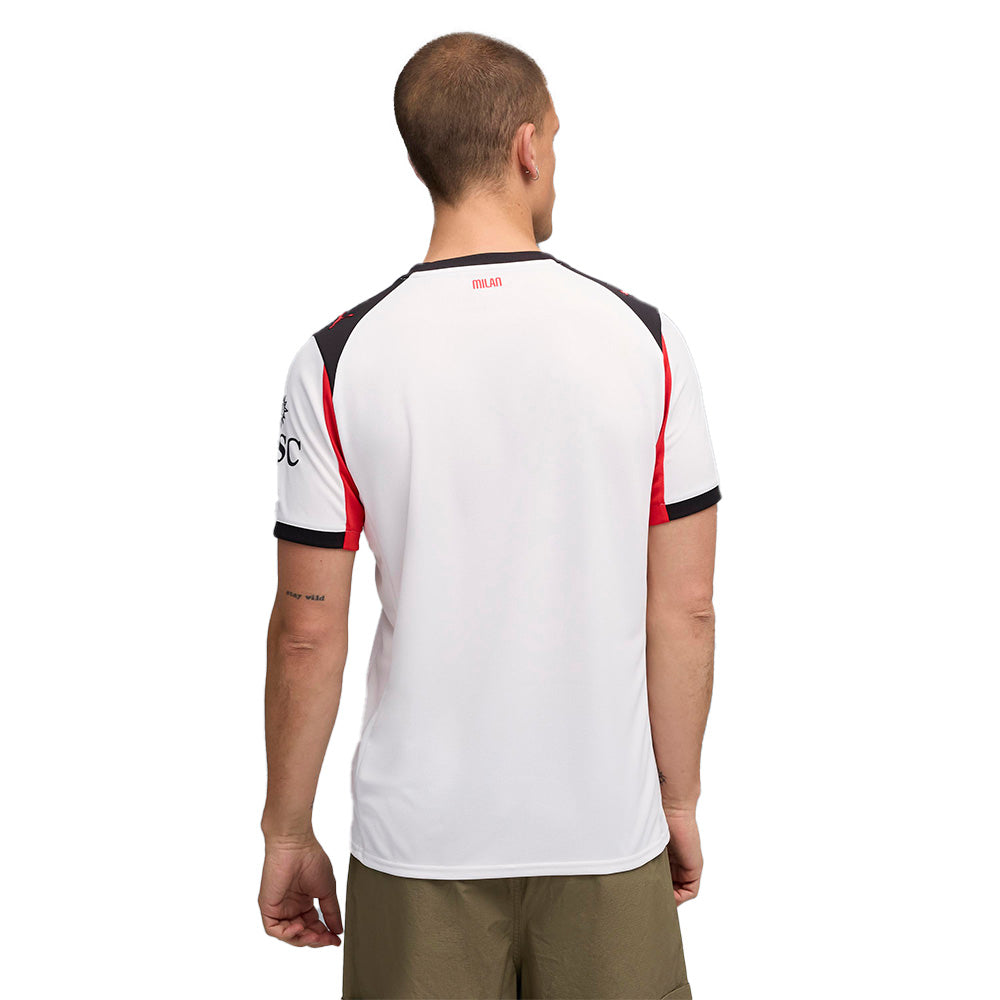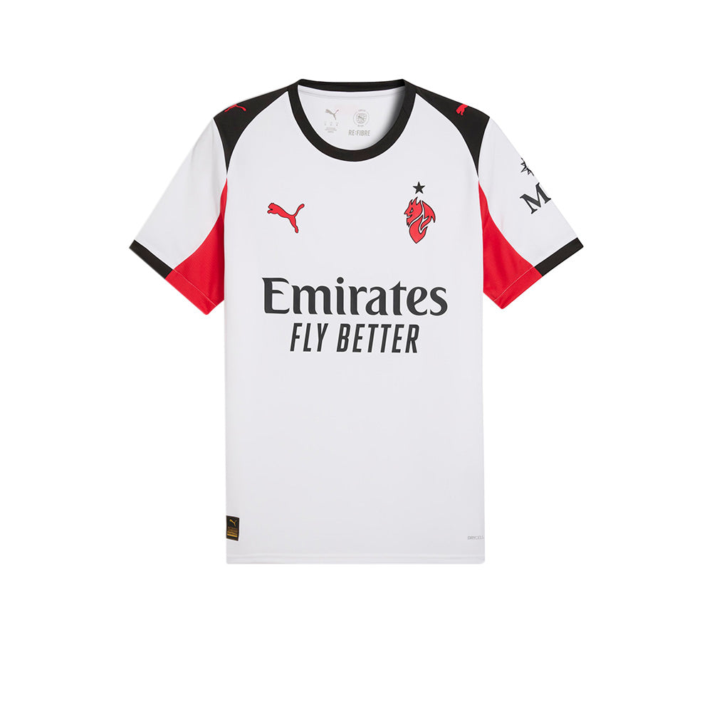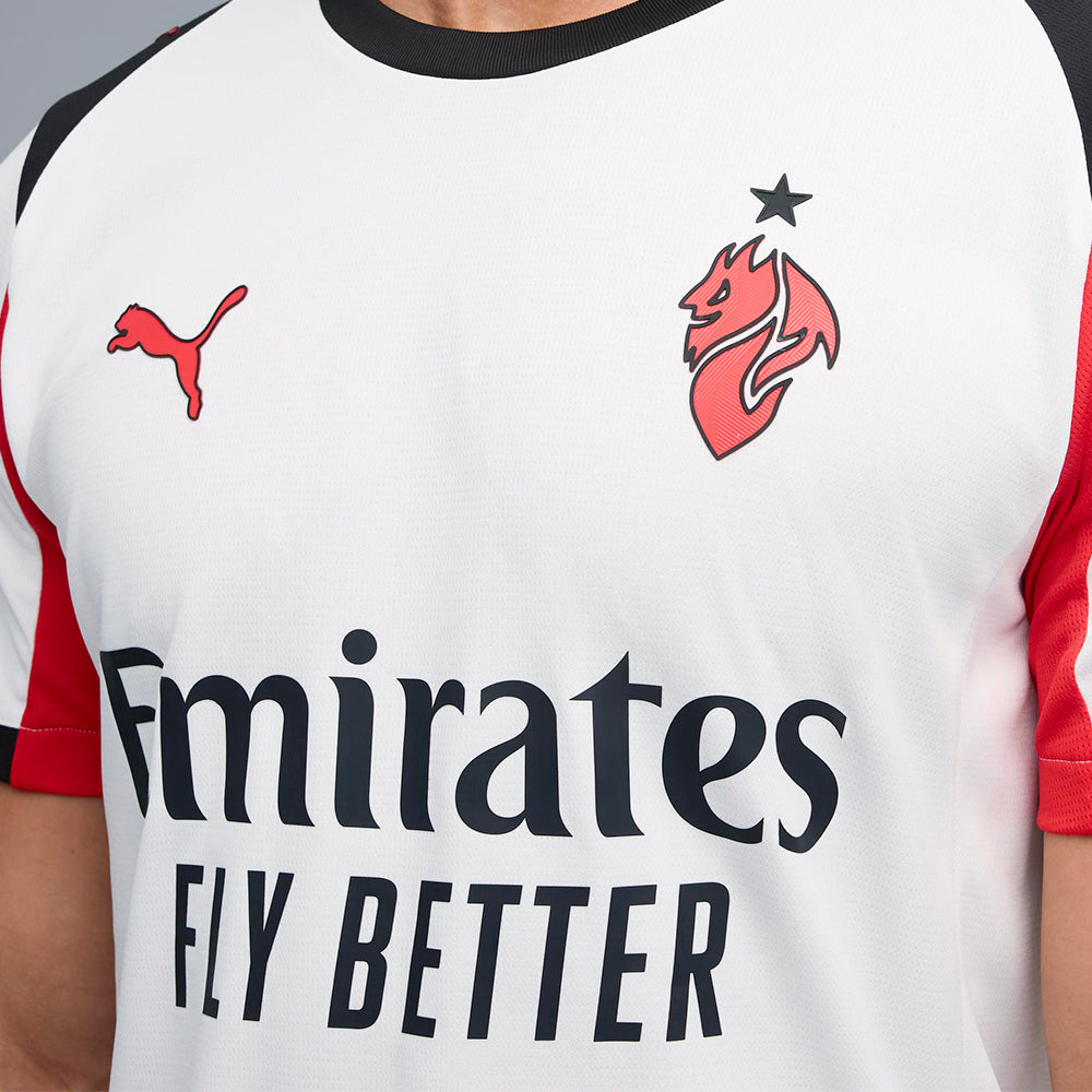 แรกเห็น อาจดูเรียบง่าย แต่เมื่อมองอีกครั้ง? ร้อนแรงเกินต้าน! เสื้อแข่งผู้ชายทีมเอซี มิลาน ชุดเยือน ฤดูกาล 2025/26 จาก PUMA รุ่นนี้ผสานสีขาวคลาสสิกกับลายเส้นแดง-ดำสุดร้อนแรง ถ่ายทอดจิตวิญญาณของปีศาจแดงดำได้อย่างสมบูรณ์แบบ จุดเด่นอยู่ที่ตราสัญลักษณ์ Diavoletto อันโด่งดังจากยุค 80 ที่รำลึกถึงประวัติศาสตร์อันยิ่งใหญ่ของสโมสร สร้างมาเพื่อแฟนตัวจริงที่ไม่ได้แค่สวมเสื้อ แต่แบกรับตำนานของ AC Milan ไว้ในหัวใจ