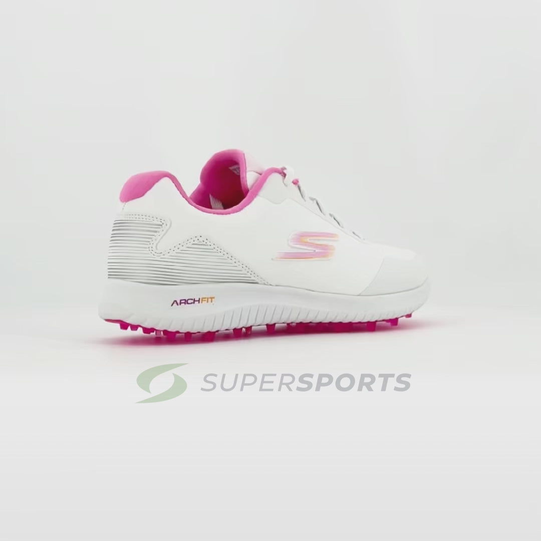 รองเท้ากอล์ฟผู้หญิง SKECHERS Go Golf Max 2 สไตล์ผูกเชือก มาพร้อมอัปเปอร์ตัดเย็บจากหนังสังเคราะห์ มีความทนทานสูง และกันน้ำได้ พื้นรองเท้าด้านในเป็นแบบถอดออก มีระบบ Arch Fit รองรับส่วนโค้งของเท้า พื้นรองเท้าด้านนอกทำจากยาง TPU แต่งแพทเทิร์น เสริมการยึดเกาะอย่างทนทาน ในขณะที่พื้นรองเท้าส่วนกลางมีน้ำหนักเบา ผสานเทคโนโลยี Ultra Flight ช่วยรองรับแรงกระแทก และซัพพอร์ตเท้าอย่างนุ่มยืดหยุ่นตลอดการสวมใส่