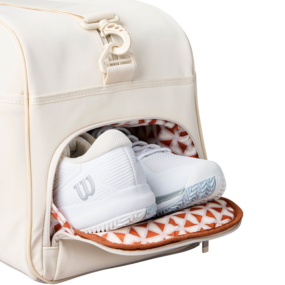 กระเป๋ายิมทรงหมอนผู้ใหญ่ WILSON Roland Garros 2025 Session Soire กระเป๋าดีไซน์พิเศษได้รับแรงบันดาลใจจากศึก French Open 2025 – Roland Garros กระเป๋ามีช่องหลักขนาดใหญ่สำหรับใส่เสื้อผ้า รองเท้า และอุปกรณ์ต่าง ๆ พร้อมช่องด้านข้างสำหรับเก็บรองเท้าแยกจากของอื่นๆอย่างเป็นระเบียบ ด้านหน้ามีช่องซิปสำหรับใส่ของชิ้นเล็ก ช่วยให้จัดเก็บและหยิบใช้งานได้สะดวก เหมาะสำหรับผู้เล่นที่ต้องการทั้งฟังก์ชันและแฟชั่นในหนึ่งเดียว